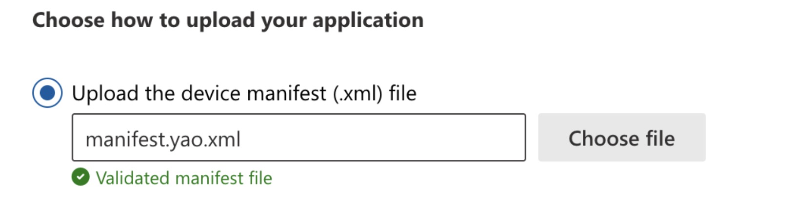 Click Choose file and select the manifest.yao.xml file from your computer. The system will validate the manifest file which you have selected.